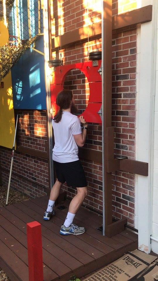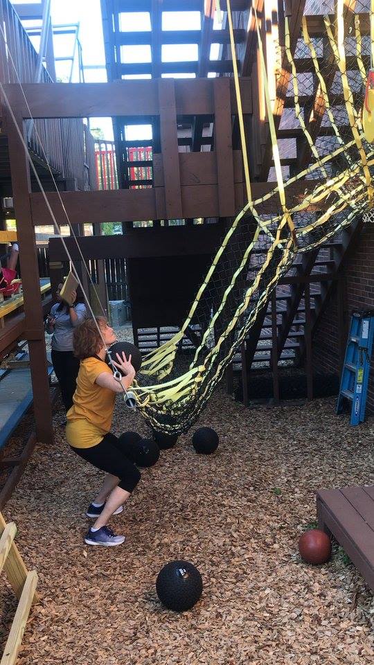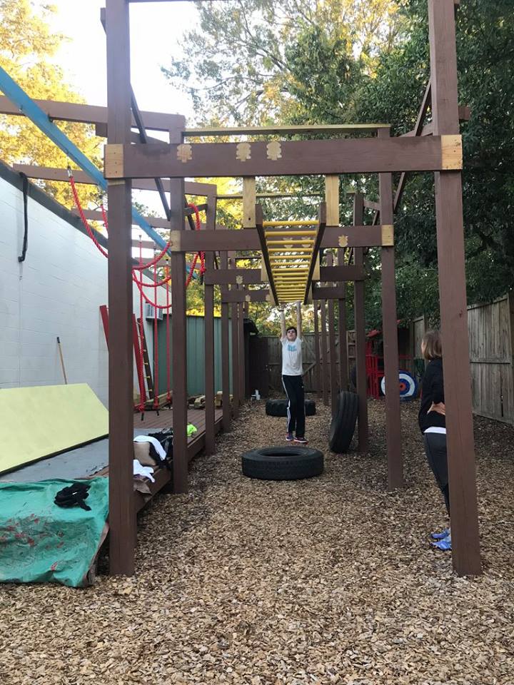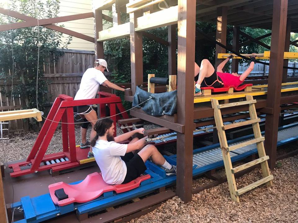 “Outdoor Workout” Those words might conjure an obstacle course but more often you simply carry your indoor workout stuff outdoors or maybe just do the dirty stuff (tire flipping or sled pushing) in the parking lot. Are you ready for a real outdoor workout? We have just opened a unique, $80,000.00 outdoor workout facility. Based on the concept of a “full body workout” we designed and built many exercise stations never been seen before, such as a human powered elevator (which travels 25 ft. into the air) and multiple self-propelled carts on track (think railroad) involving pushing and pulling exercises. We have games from the State Fair such as High Striker (sledge-hammer-ring- bell) and medicine ball basketball with speed return. Trainers often haul their clients to stadium steps for a great run but we built two, 3 stories high flights right here! All the traditional obstacles are here; rope climb, Tarzan rope swing, several types of monkey bars, cargo net climb, slanted rope wall, as well as Spartan-specific log and sandbag carry, spear throw, traverse rope, rock bucket fill-and-carry, A-frame monkey bars and more. Got Old School? Of course we have a wide variety of tires for flipping, and sleds for pushing, but you have to be verrry old school for stuff like our two man saw or the two man rock carry tongs! We intend to have full Spartan type runs with everything but the mud in the very near future and we feel that we are the only facility anywhere near Columbia (and maybe in S.C.) that can truly say this. In October we quietly opened our anybody-can-do-it course to our existing clients and they went nuts! Suddenly the young who had to be dragged to the gym were excited and our senior’s class (average age 74) had to be dragged off the course when the workout was over. Frontier Movement has led the way in Fitness for 22 years but now we are taking a quantum leap forward in creating a balanced full body workout in the great outdoors!